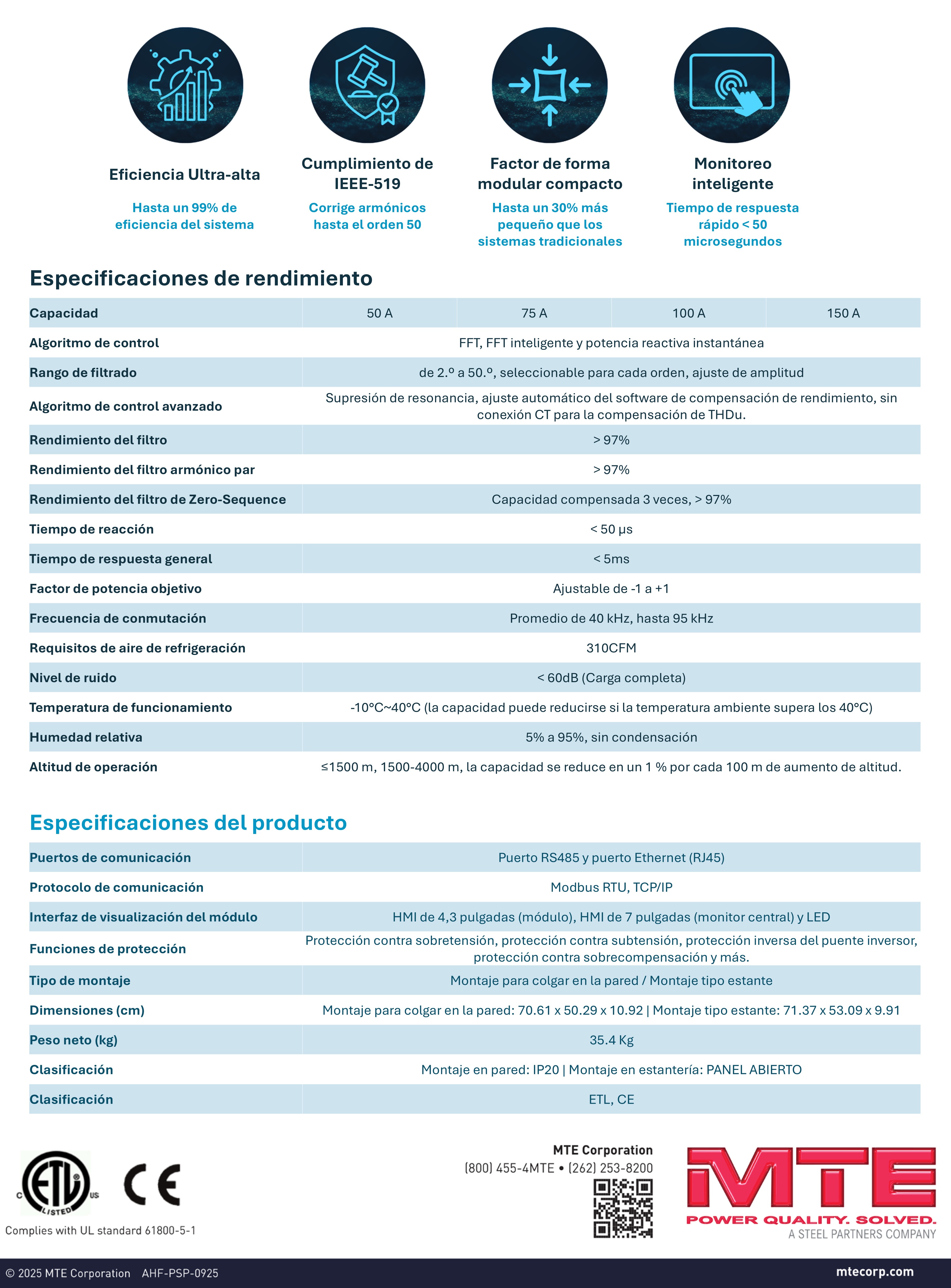 Responde a los cambios en menos de 50 microsegundos y maneja múltiples firmas armónicas a la vez, incluyendo VFD de 6 pulsos, ventiladores EC y LED. Con un máximo de 99% de eficiencia del sistema, se reduce las pérdidas de energía hasta un 30% en comparación con los filtros convencionales.